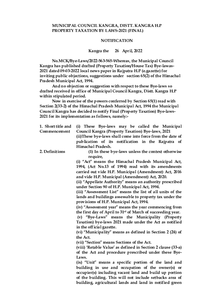 MUNICIPAL COUNCIL ANGRY, DIST. ANGRY H. P PROPERTY TAXATION BY LAWS2021 (FINAL) NOTIFICATION Angry the26 April, 2022No.MCK/ByeLaws/2022563565Whereas, the Municipal Council Angry has published drafted