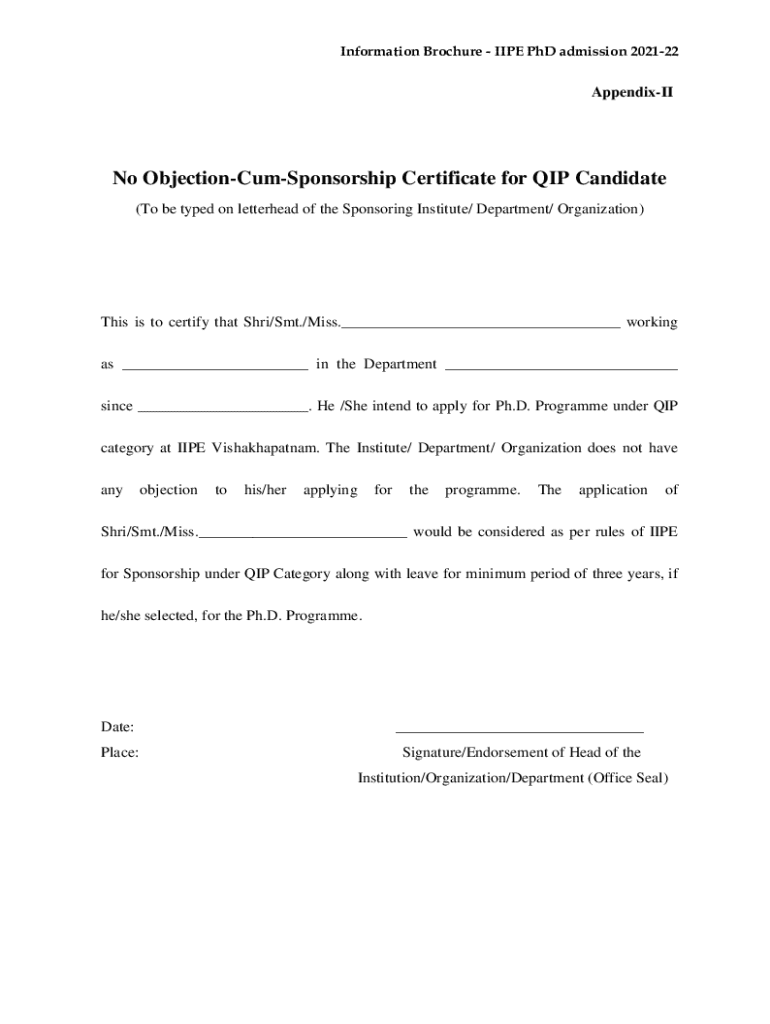 Information Brochure PIPE PhD admission 202122AppendixIINo ObjectionCumSponsorship Certificate for HIP Candidate (To be typed on letterhead of the Sponsoring Institute/ Department/ Organization)This