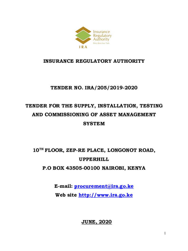 INSURANCE REGULATORY AUTHORITYTENDER NO. IRA/205/20192020 TENDER FOR THE SUPPLY, INSTALLATION, TESTING AND COMMISSIONING OF ASSET MANAGEMENT SYSTEM10TH FLOOR, ZEP RE PLACE, LONGMONT ROAD, UPHILL P.