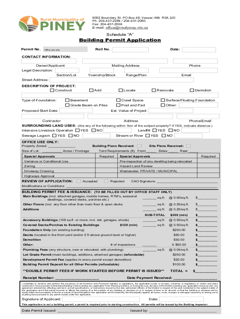 6092 Boundary St. PO Box 48, Vassar, MB R0A 2J0 pH: 2044372284 / 2044372060 Fax: 2044372556Email: office@rmofpiney.mb.caSchedule Building Permit Application Permit No. Roll No. Office use validate:CONTACT