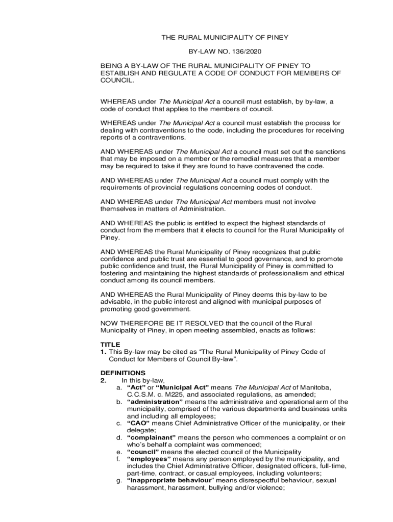 THE RURAL MUNICIPALITY OF PINEY BYLAW NO. 136/2020 BEING A BYLAW OF THE RURAL MUNICIPALITY OF PINEY TO ESTABLISH AND REGULATE A CODE OF CONDUCT FOR MEMBERS OF COUNCIL.WHEREAS under The Municipal Act