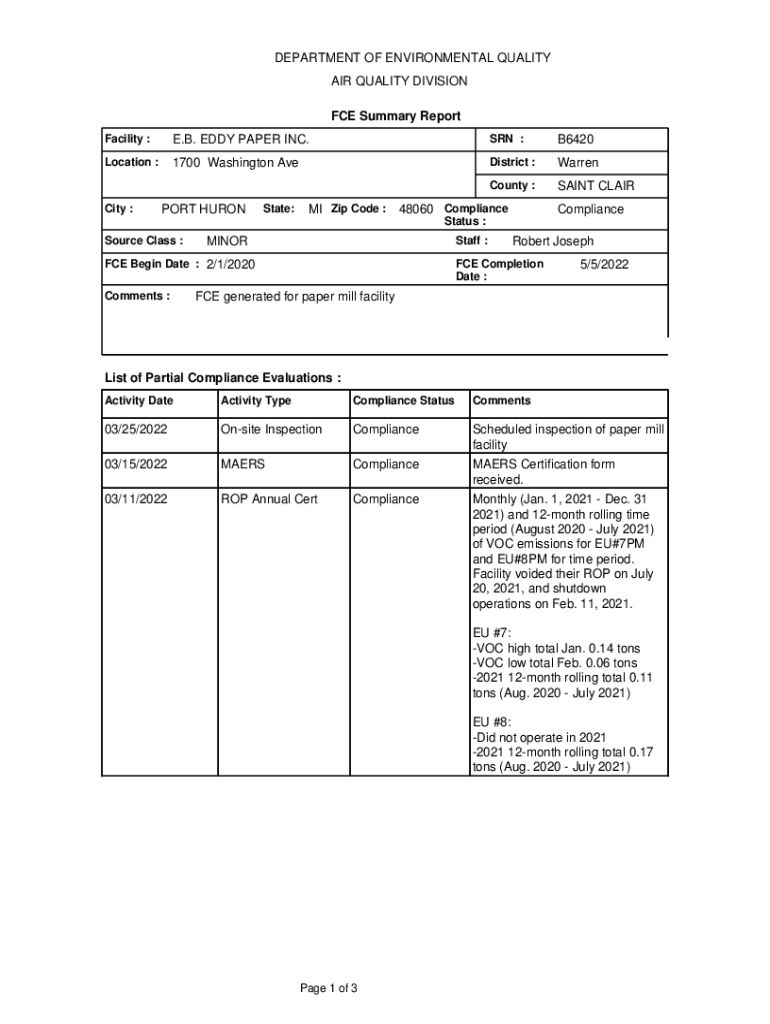 DEPARTMENT OF ENVIRONMENTAL QUALITY AIR QUALITY DIVISION FCE Summary Report Facility :E.B. EDDY PAPER INC.SON :B6420Location :1700 Washington Redistrict :LaRue County :SAINT Clarity :PORT Prostate:MI
