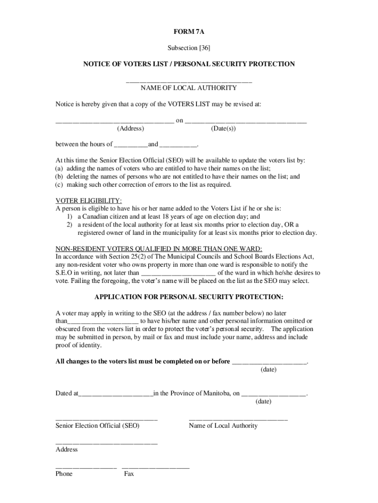 FORM 7A Subsection [36] NOTICE OF VOTERS LIST / PERSONAL SECURITY PROTECTION ___ NAME OF LOCAL AUTHORITY Notice is hereby given that a copy of the VOTERS LIST may be revised at: ___ on ___ (Address)
