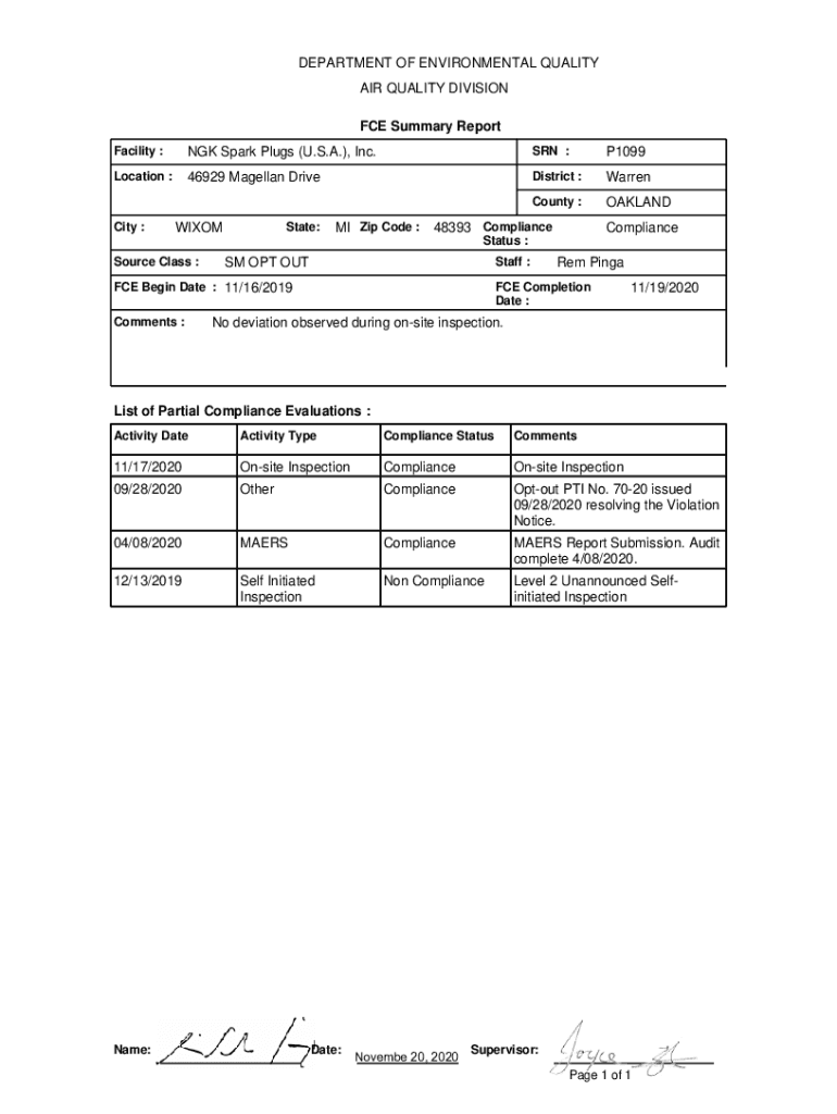 DEPARTMENT OF ENVIRONMENTAL QUALITY AIR QUALITY DIVISION FCE Summary Report Facility :NGC Spark Plugs (U.S.A.), Inc. SON :P1099Location :46929 Magellan Redistrict :LaRue County :OAKLANDCity :State:XIAOMI