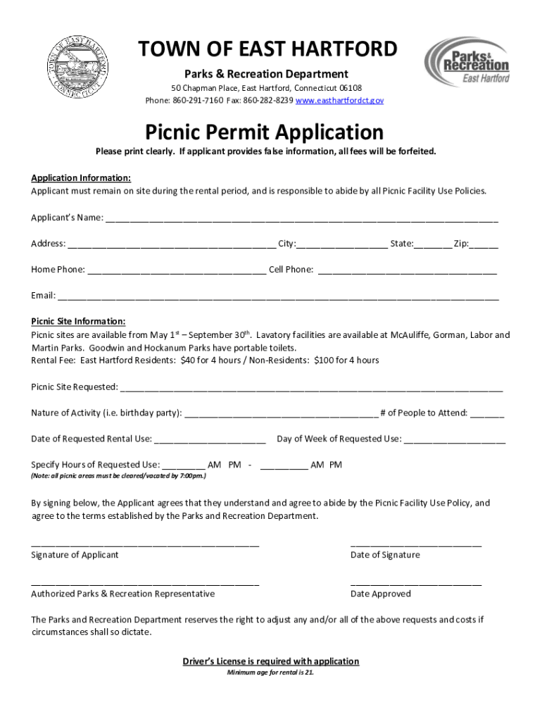 TOWN OF EAST HARTFORD Parks & Recreation Department 50 Chapman Place, East Hartford, Connecticut 06108 Phone: 8602917160 Fax: 8602828239 www.easthartfordct.govPicnic Permit Application Please print