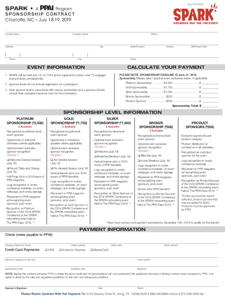 SPARK AA's of 7/27/2018PPAI ProgramSPONSORSHIP CONTRACT Charlotte, NC July 1819, 2019designed for the #next gen___ Contact Accompany Nameplate #___ AddressCityState/ProvinceCountryZIP/Postal Code()