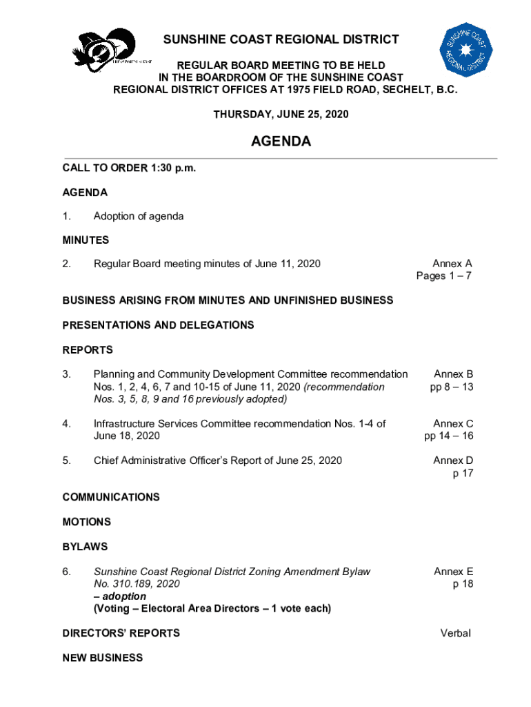 SUNSHINE COAST REGIONAL DISTRICT REGULAR BOARD MEETING TO BE HELD IN THE BOARDROOM OF THE SUNSHINE COAST REGIONAL DISTRICT OFFICES AT 1975 FIELD ROAD, SECRET, B.C. THURSDAY, JUNE 25, 2020AGENDA CALL
