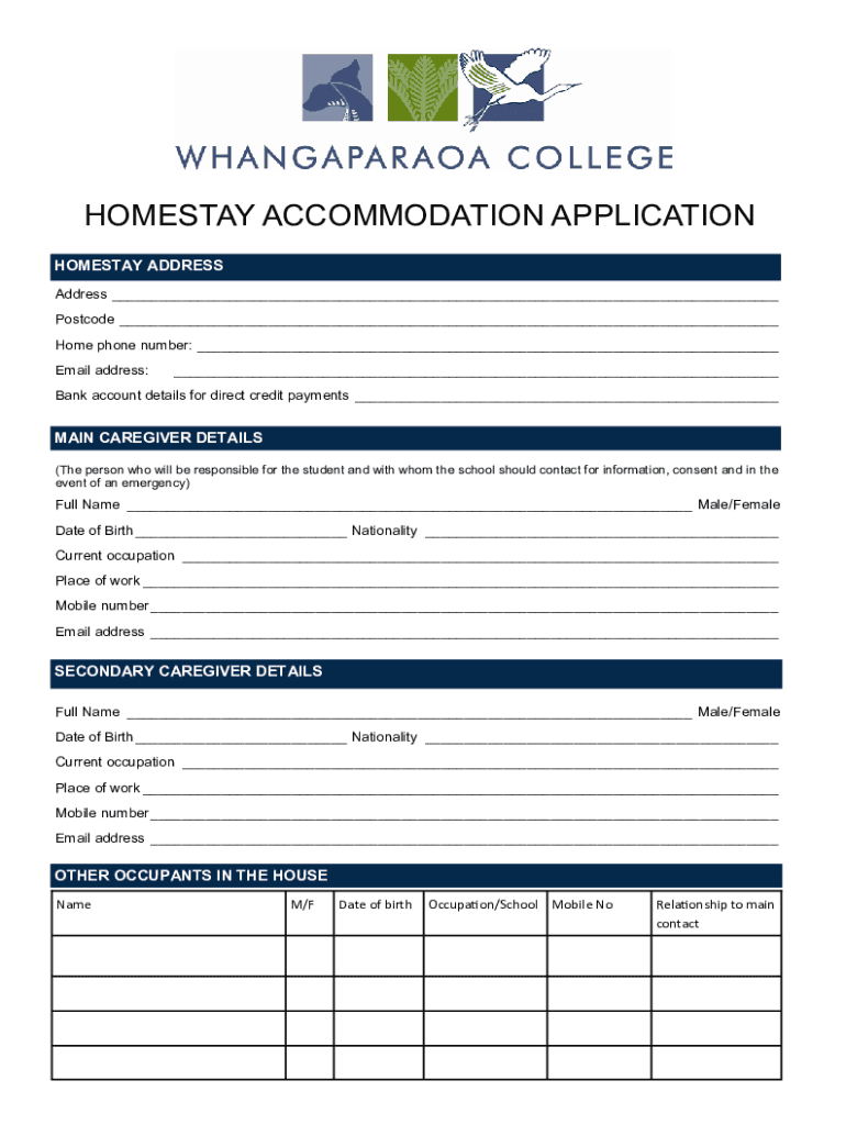 HOMESTAY ACCOMMODATION APPLICATION HOMESTAY ADDRESS ___ Postcode ___ Home phone number: ___ Email address:___Bank account details for direct credit payments ___MAIN CAREGIVER DETAILS (The person who