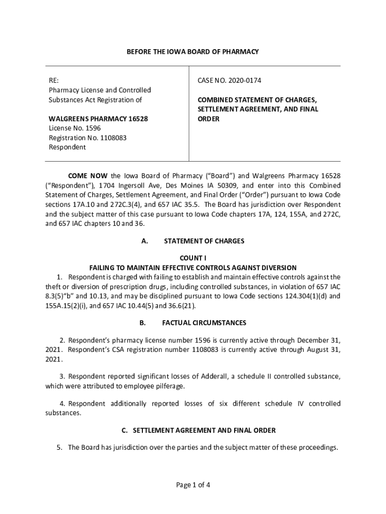 BEFORE THE IOWA BOARD OF PHARMACY RE: Pharmacy License and Controlled Substances Act Registration of WALGREENS PHARMACY 16528 License No. 1596 Registration No. 1108083 Respondent CASE NO. 20200174