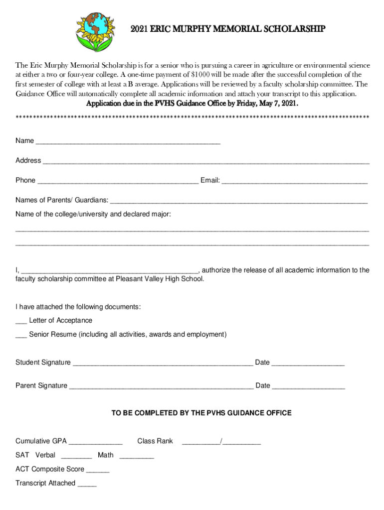 2021 ERIC MURPHY MEMORIAL Scholarship Eric Murphy Memorial Scholarship is for a senior who is pursuing a career in agriculture or environmental science at either a two or Fourier college. A onetime
