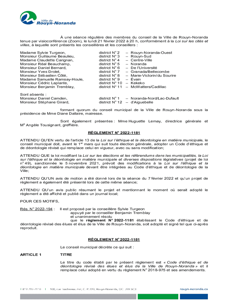 One since regular DES members Du Conrail de la Villa de RouynNoranda tenure par videoconference (Zoom), LE Lundy 21 frier 2022 20 h, conferment la LOI SUR LES cit set villas, LaBelle sent presents