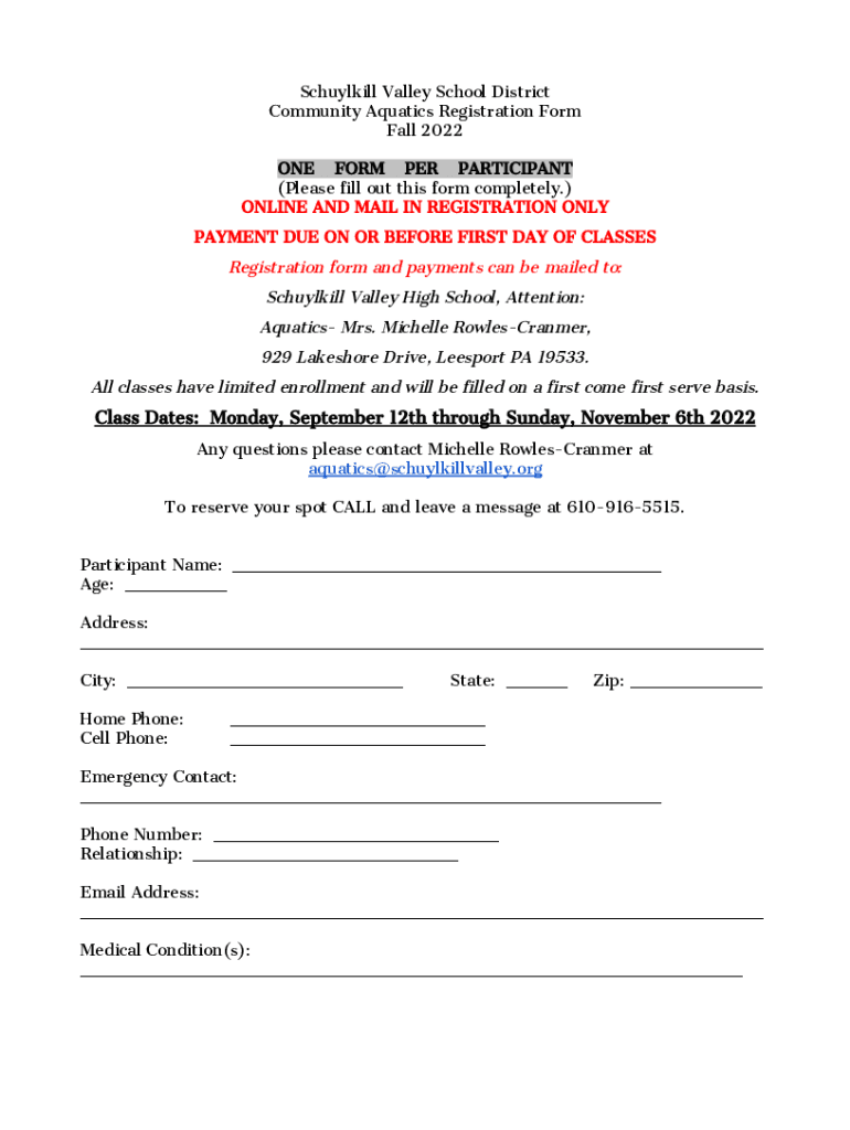 Schuylkill Valley School District Community Aquatics Registration Form Fall 2022 ONE FORM PER PARTICIPANT (Please fill out this form completely.) ONLINE AND MAIL IN REGISTRATION ONLY PAYMENT DUE ON