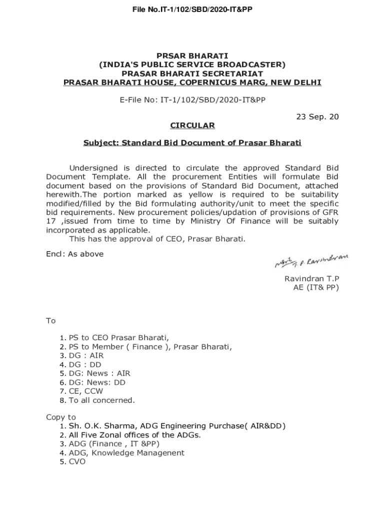 File No.IT1/102/SBD/2020IT&PPPRSAR BHARAT (INDIA\'S PUBLIC SERVICE BROADCASTER) PRA SAR BHARAT SECRETARIAT PRA SAR BHARAT HOUSE, COPERNICUS MARY, NEW DELHI File No: IT1/102/SBD/2020IT&PP 23 Sep. 20