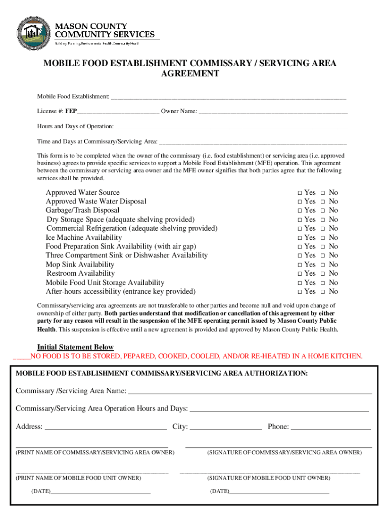 MOBILE FOOD ESTABLISHMENT COMMISSARY / SERVICING AREA AGREEMENT Mobile Food Establishment: ___ License #: FEP___ Owner Name: ___ Hours and Days of Operation: ___ Time and Days at Commissary/Servicing