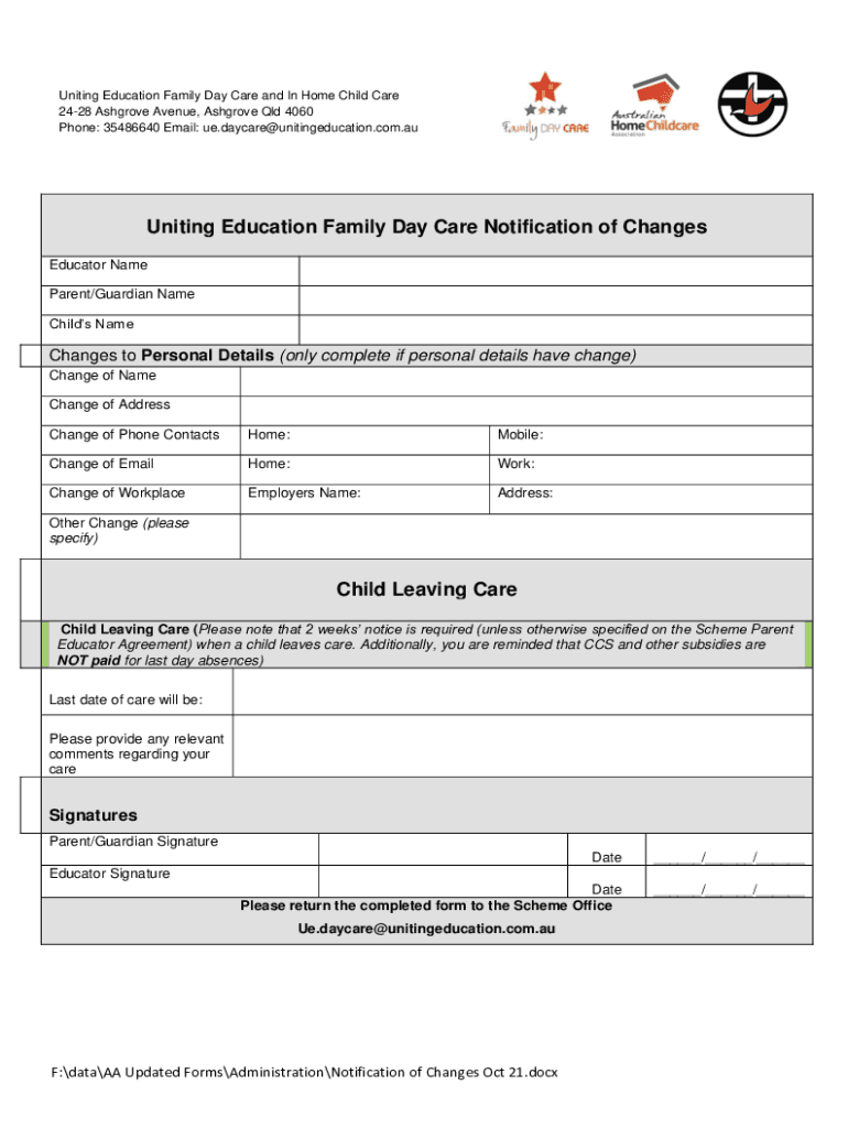 Get the free Uniting Education Family Day Care Notification of Changes Child ...