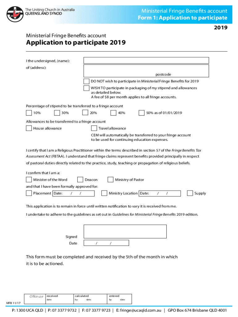 Ministerial Fringe Benefits account Form 1: Application to participate 2019 Ministerial Fringe Benefits accountApplication to participate 2019 I the undersigned, (name):of (address):postcode DO NOT