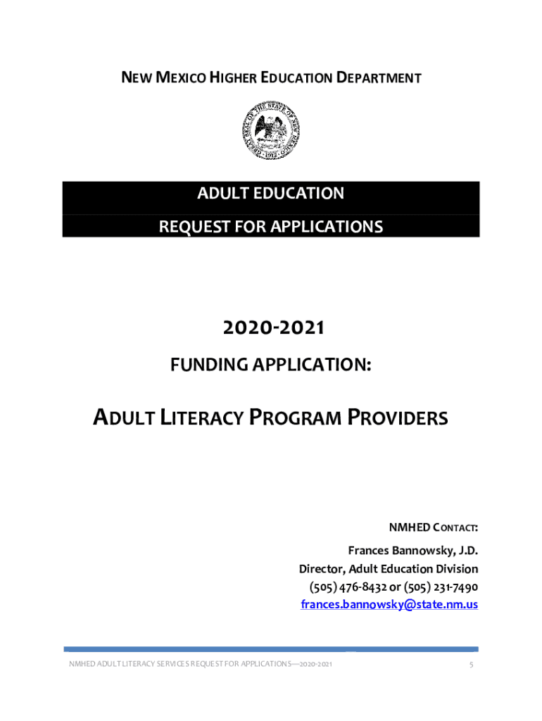 NEW MEXICO HIGHER EDUCATION DEPARTMENTAL EDUCATION REQUEST FOR APPLICATIONS20202021 FUNDING APPLICATION:ADULT LITERACY PROGRAM PROVIDERSNMHED CONTACT: Frances Bannock, J.D. Director, Adult Education