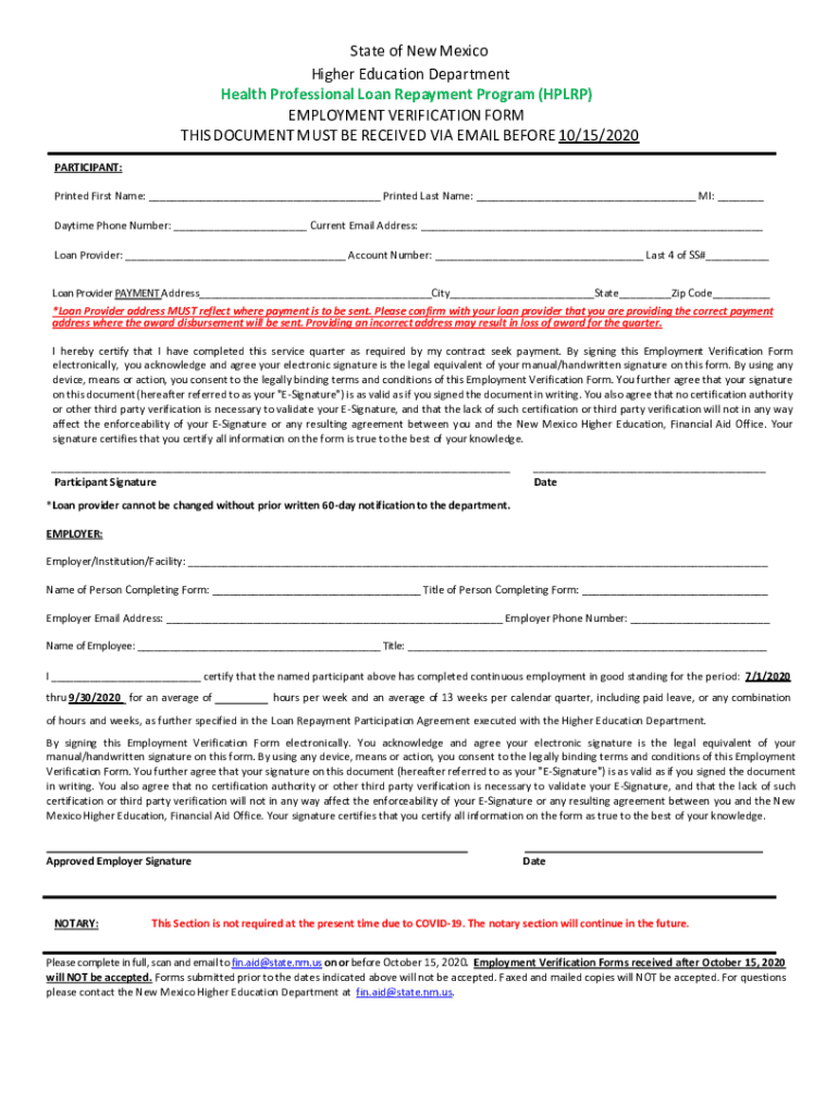 State of New Mexico Higher Education Department Health Professional Loan Repayment Program (HP LRP) EMPLOYMENT VERIFICATION FORM THIS DOCUMENT MUST BE RECEIVED VIA EMAIL BEFORE 10/15/2020 PARTICIPANT:
