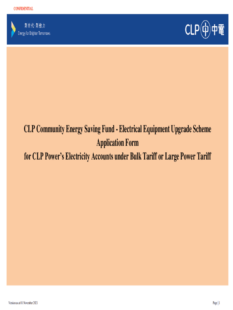 CONFIDENTIAL CLP Community Energy Saving Fund Electrical Equipment Upgrade Scheme Application Form for CLP Powers Electricity Accounts under Bulk Tariff or Large Power TariffVersion as at 01 November