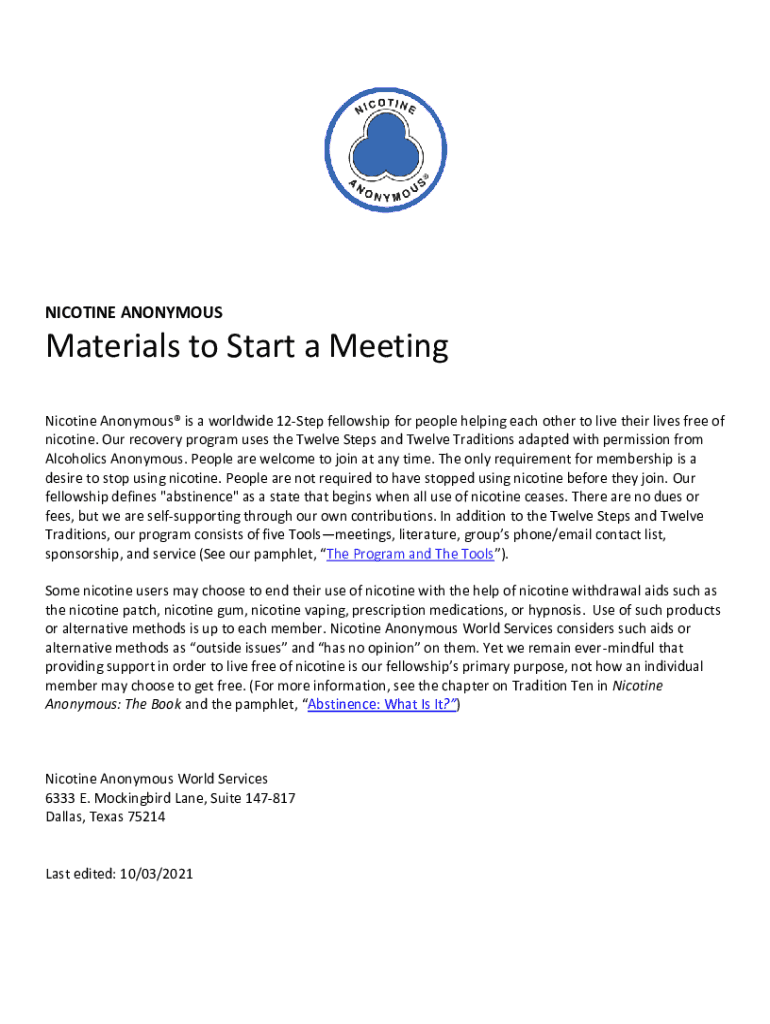 NICOTINE ANONYMOUSMaterials to Start a Meeting Nicotine Anonymous is a worldwide 12Step fellowship for people helping each other to live their lives free of nicotine. Our recovery program uses the