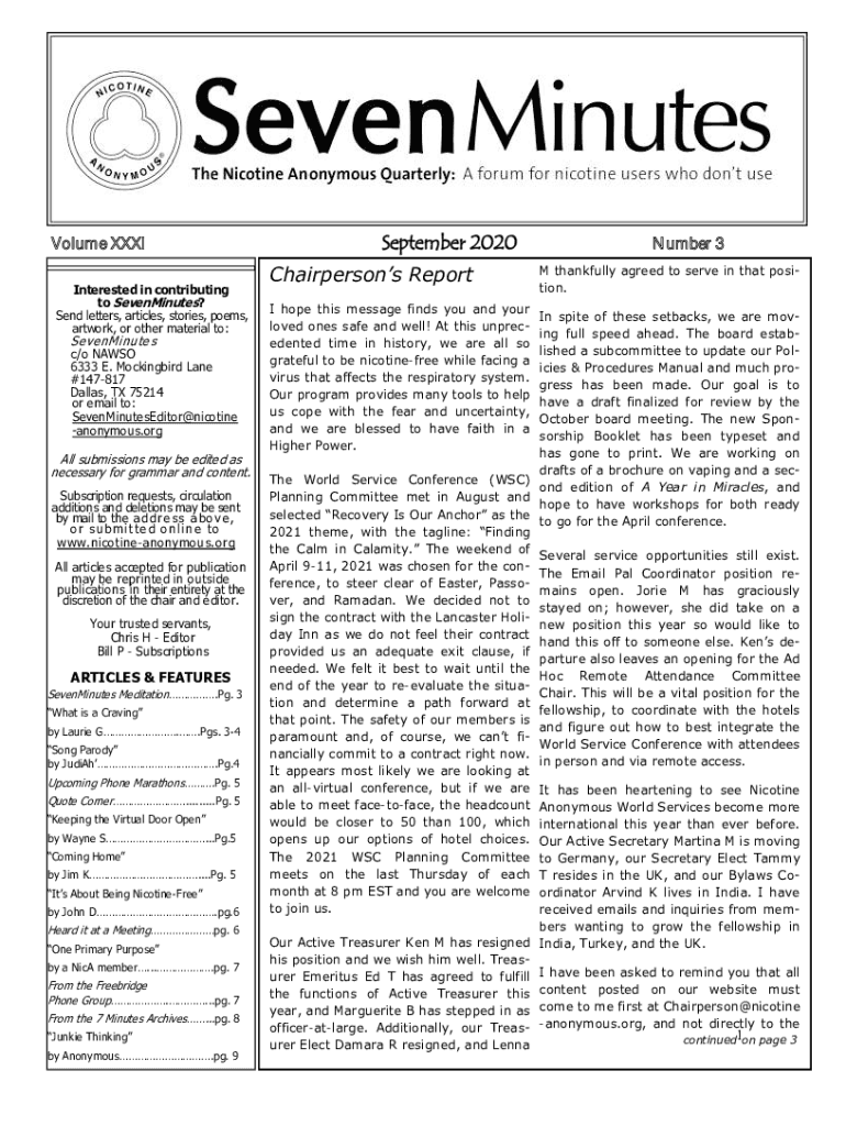 Volume XXXI Interested in contributing to SevenMinutes? Send letters, articles, stories, poems, artwork, or other material to:SevenMinutesc/o NAWSA 6333 E. Mockingbird Lane #147817 Dallas, TX 75214