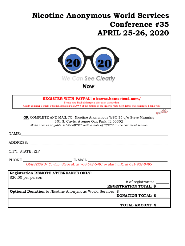 Nicotine Anonymous World Services Conference #35 APRIL 2526, 2020REGISTER WITH PayPal! nicawsc.homestead.com/ Please note PayPal charges us for each transaction. Kindly consider a small, optional,