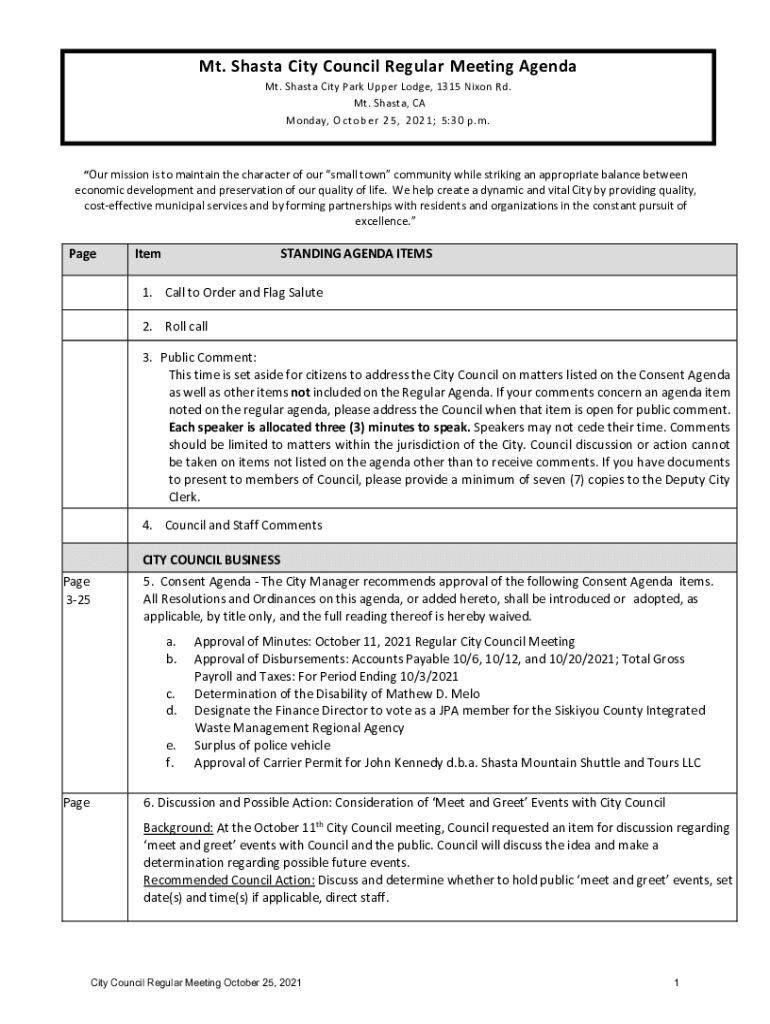Mt. Shasta City Council Regular Meeting Agenda Mt. Shasta City Park Upper Lodge, 1315 Nixon Rd. Mt. Shasta, CA Monday, O c t o b e r 2 5, 2 0 2 1 ; 5:30 p.m. Our mission is to maintain the character