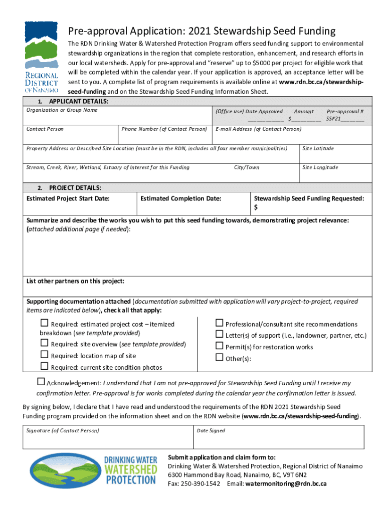 Preapproval Application: 2021 Stewardship Seed Funding The RUN Drinking Water & Watershed Protection Program offers seed funding support to environmental stewardship organizations in the region that