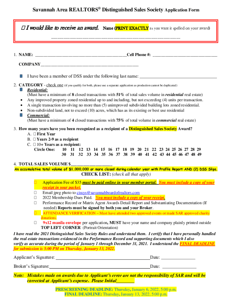 Savannah Area REALTORS Distinguished Sales Society Application Form I would like to receive an award. Name (PRINT EXACTLY as you want it spelled on your award)___ ___ 1. NAME: ___Cell Phone #: ___