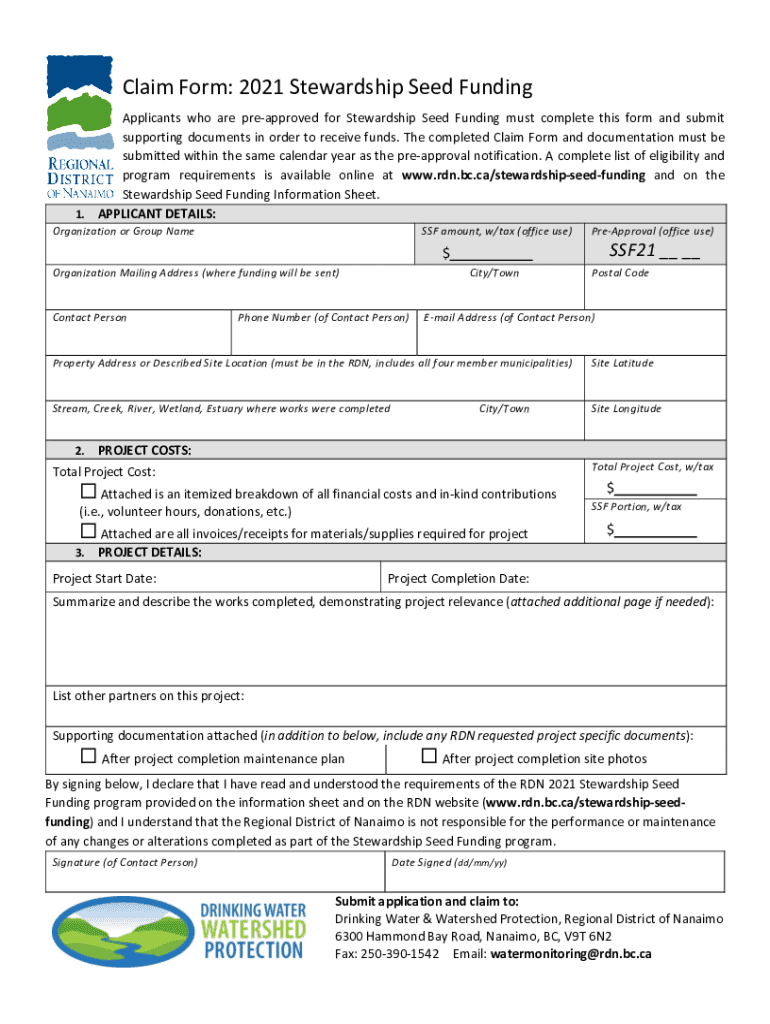 Claim Form: 2021 Stewardship Seed Funding Applicants who are preapproved for Stewardship Seed Funding must complete this form and submit supporting documents in order to receive funds. The completed