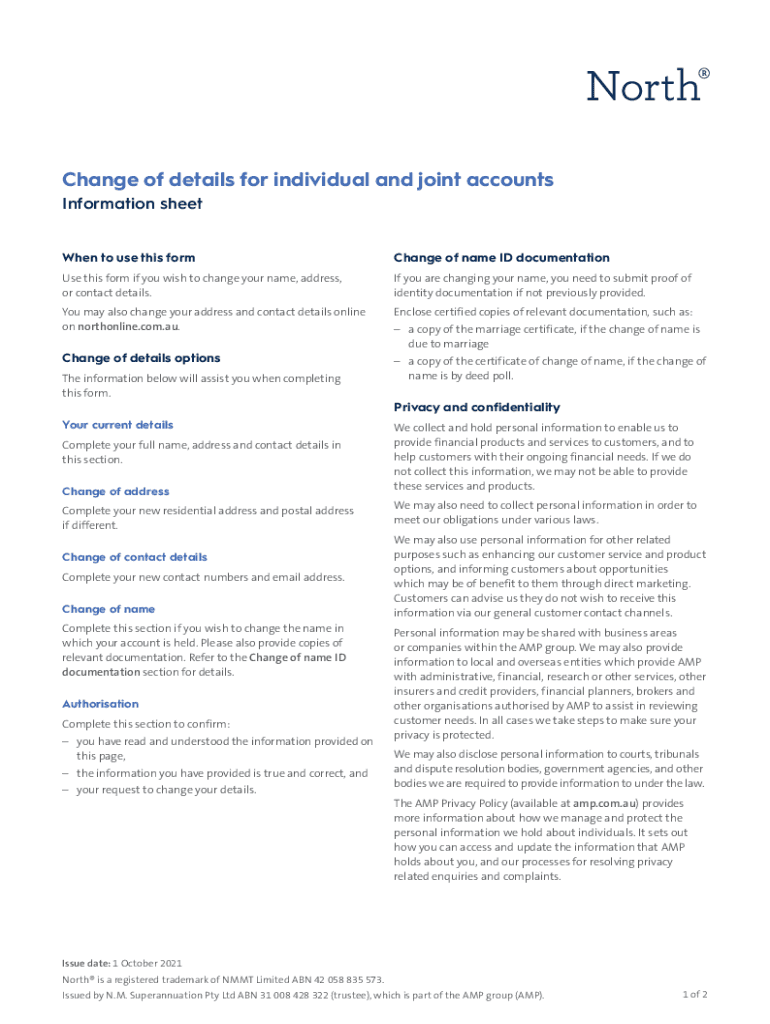 Change of details for individual and joint accounts Information sheet When to use this shortchanges of name ID documentations this form if you wish to change your name, address, or contact details.