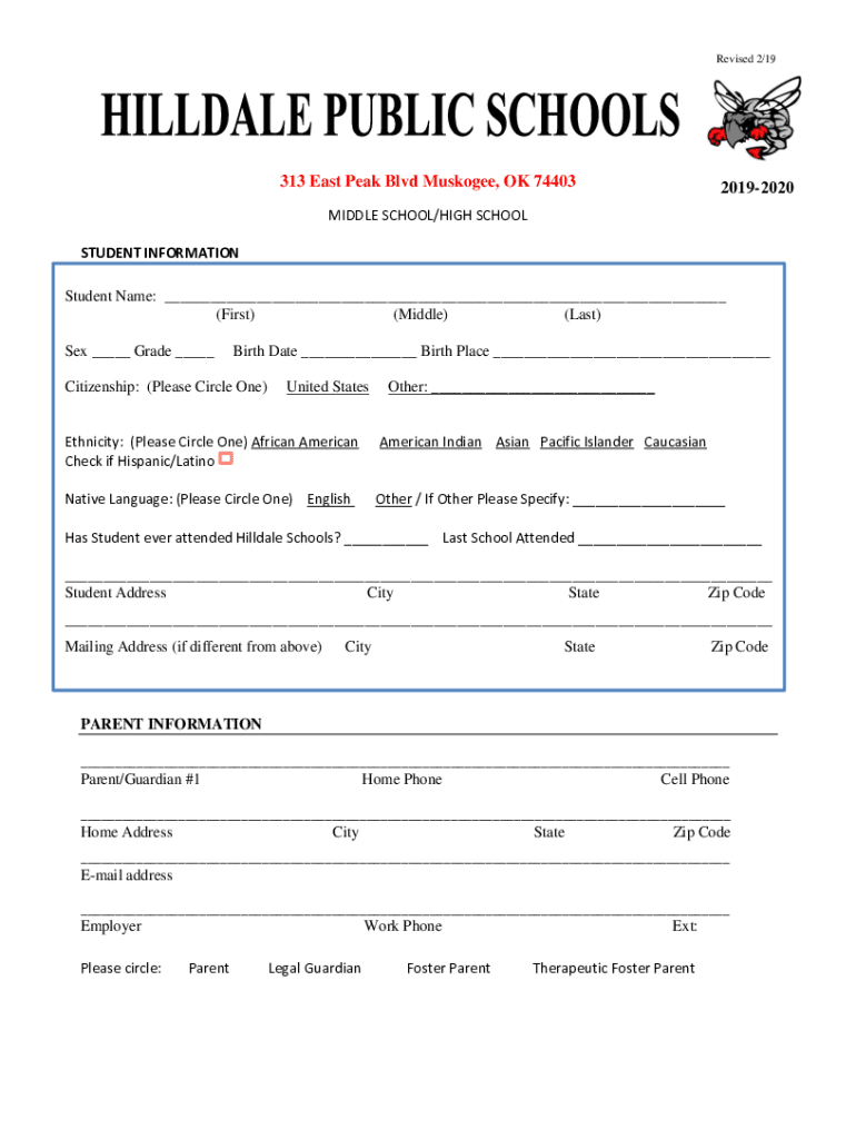 Revised 2/19313 East Peak Blvd Muskogee, OK 7440320192020MIDDLE SCHOOL/HIGH SCHOOL