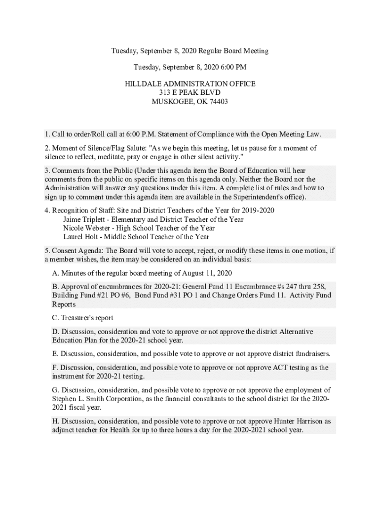 Tuesday, September 8, 2020, Regular Board Meeting Tuesday, September 8, 2020 6:00 PM HILLSDALE ADMINISTRATION OFFICE 313 E PEAK BLVD MUSKOGEE, OK 744031. Call to order/Roll call at 6:00 P.M. Statement