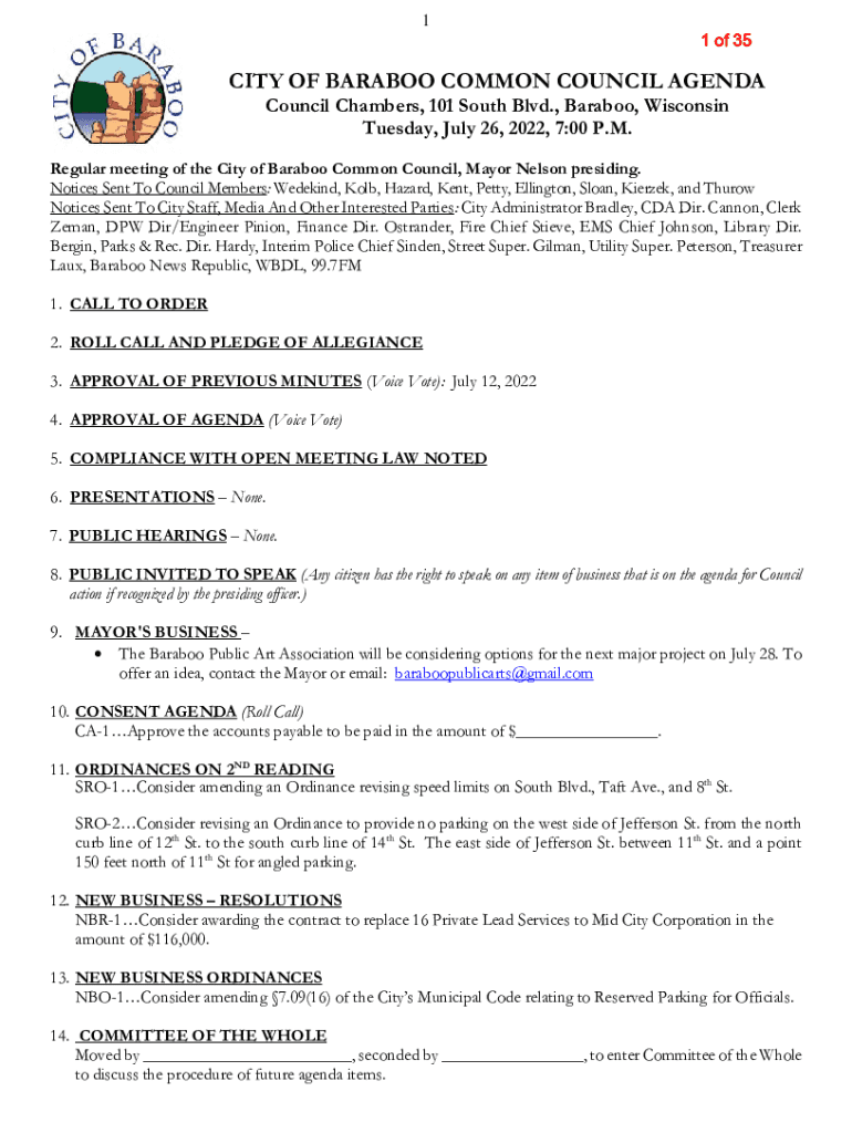 11 of 35CITY OF BAMBOO COMMON COUNCIL AGENDA Council Chambers, 101 South Blvd., Bamboo, Wisconsin Tuesday, July 26, 2022, 7:00 P.M. Regular meeting of the City of Bamboo Common Council, Mayor Nelson