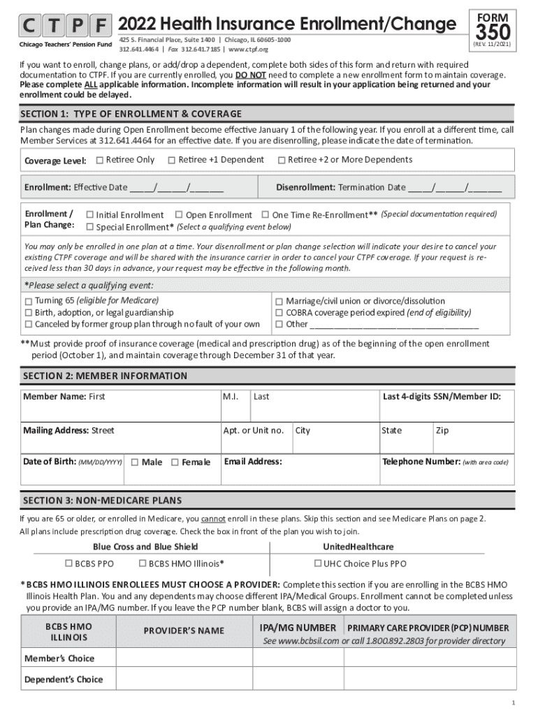 2022 Health Insurance Enrollment/Change 425 S. Financial Place, Suite 1400 | Chicago, IL 606051000 312.641.4464 | Fax 312.641.7185 | www.ctpf.orgFORM350(REV. 11/2021)If you want to enroll, change