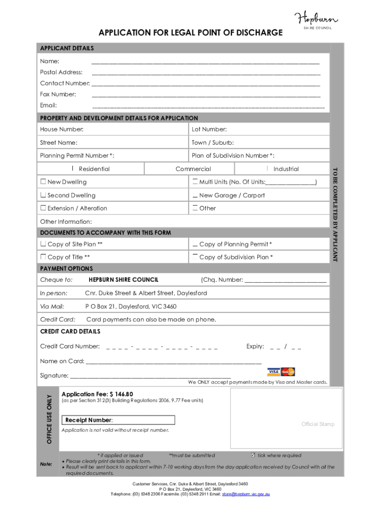 APPLICATION FOR LEGAL POINT OF DISCHARGE APPLICANT DETAILS Name:___Postal Address:___Contact Number: ___ Fax Number:___Email:___PROPERTY AND DEVELOPMENT DETAILS FOR APPLICATION House Number:Lot Number:Street