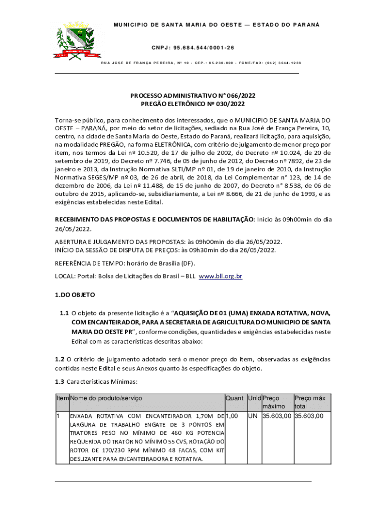 MUNICIPAL DE SANTA MARIA DO OE STE ESTATE DO PARANCNPJ: 95.684.544/000126 RUA JOSE DE FRANK PEREIRA, N 10 CEP.: 85.230000 ONE/FAX: (042) 36441238___PROCESS ADMINISTRATIVE N 066/2022 PRESO ELECTRIC