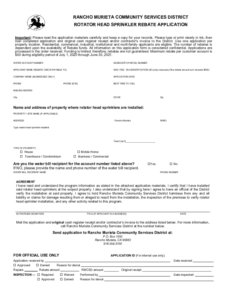 RANCHO MURRIETA COMMUNITY SERVICES DISTRICT ROTATOR HEAD SPRINKLER REBATE APPLICATION Important: Please read the application materials carefully and keep a copy for your records. Please type or print