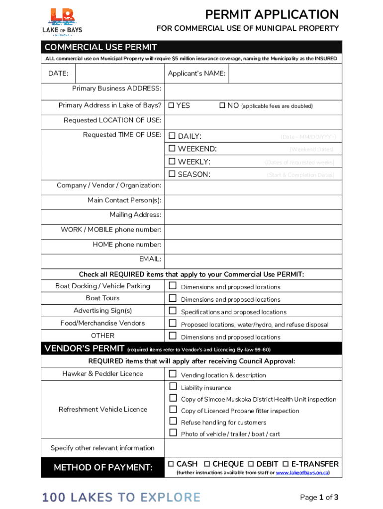 PERMIT APPLICATION COMMERCIAL USE OF MUNICIPAL PROPERTYCOMMERCIAL USE PERMIT ALL commercial use on Municipal Property will require $5 million insurance coverage, naming the Municipality as the INSUREDDATE:Applicants