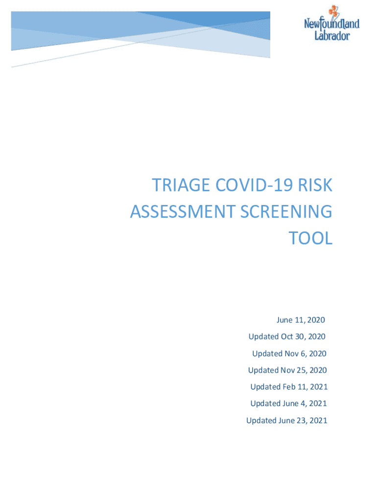 TRIAGE COVID-19 RISK ASSESSMENT SCREENING TOOL June 11, 2020, Updated Oct 30, 2020 Updated Nov 6, 2020 Updated Nov 25, 2020 Updated Feb 11, 2021 Updated June 4, 2021, Updated June 23, 2021This COVID-19