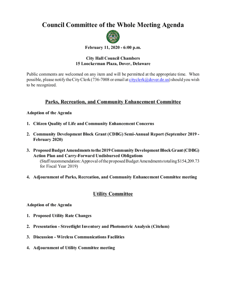 Council Committee of the Whole Meeting Agenda February 11, 2020 6:00 p.m. City Hall Council Chambers 15 Lieberman Plaza, Dover, Delaware Public comments are welcomed on any item and will be permitted