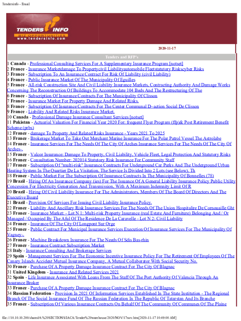 Tenders info Email20201117Tenders and RFP\'s1 Canada Professional Consulting Services For A Supplementary Insurance Program [not set] 2 France Insurance Market damage To Property civil Liability automobile