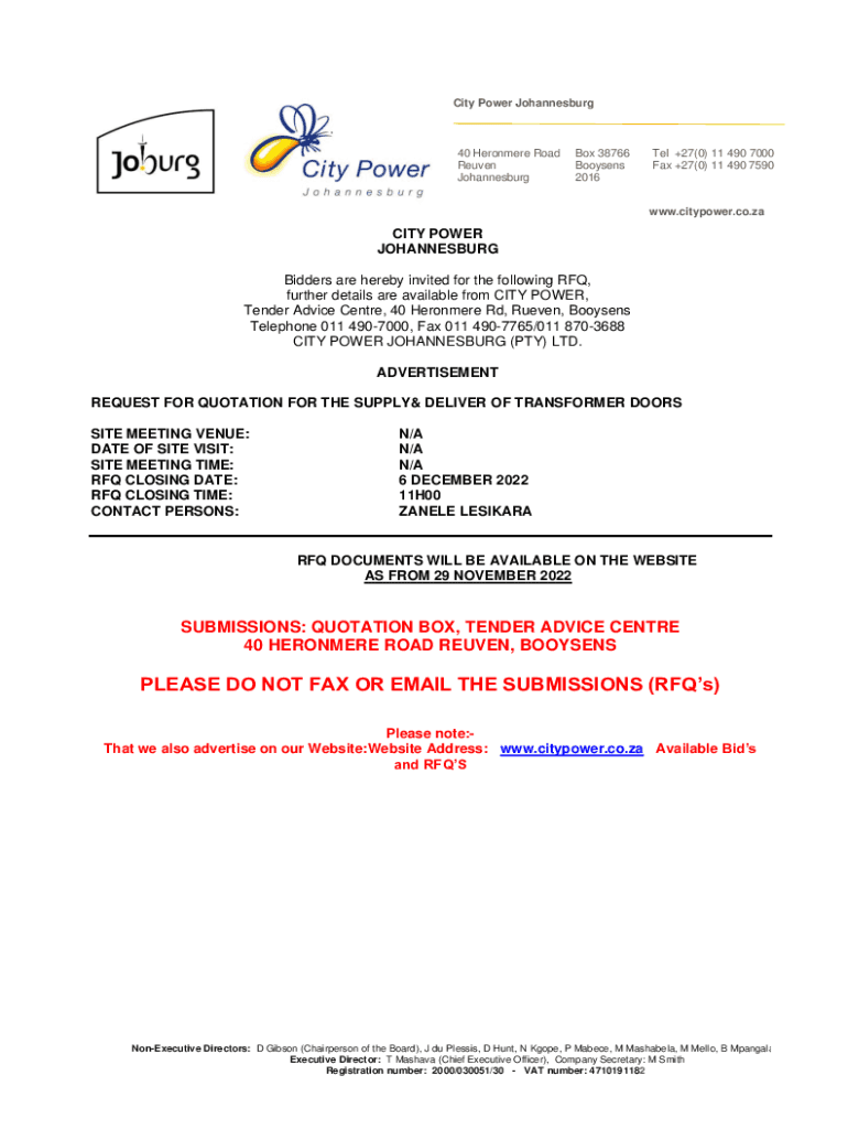 City Power Johannesburg40 Heron mere Road PO B Box 38766 Reuben Loosens Johannesburg 2016Tel +27(0) 11 490 7000 Fax +27(0) 11 490 7590www. City power.co.city POWER JOHANNESBURG Bidders are hereby