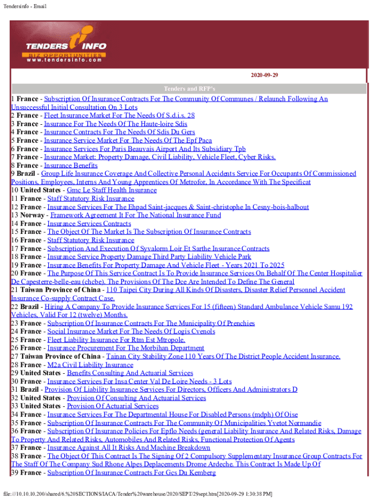 Tenders info Email20200929Tenders and RFP\'s1 France Subscription Of Insurance Contracts For The Community Of Communes / Relaunch Following An Unsuccessful Initial Consultation On 3 Lots 2 France