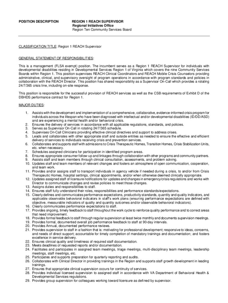 POSITION DESCRIPTIONREGION 1 REACH SUPERVISOR Regional Initiatives Office Region Ten Community Services BoardCLASSIFICATION TITLE: Region 1 REACH Supervisor GENERAL STATEMENT OF RESPONSIBILITIES: