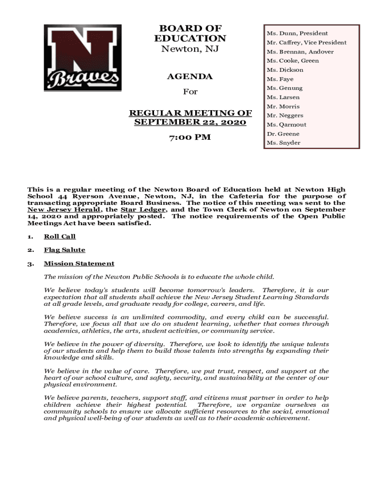 BOARD OF EDUCATION Newton, JMS. Dunn, President Mr. Camera, Vice President Ms. Brennan, Andover Ms. Cooke, GreenAGENDA For REGULAR MEETING OF SEPTEMBER 22, 2020 7:00 MMS. Dickson Ms. Faye Ms. Genus