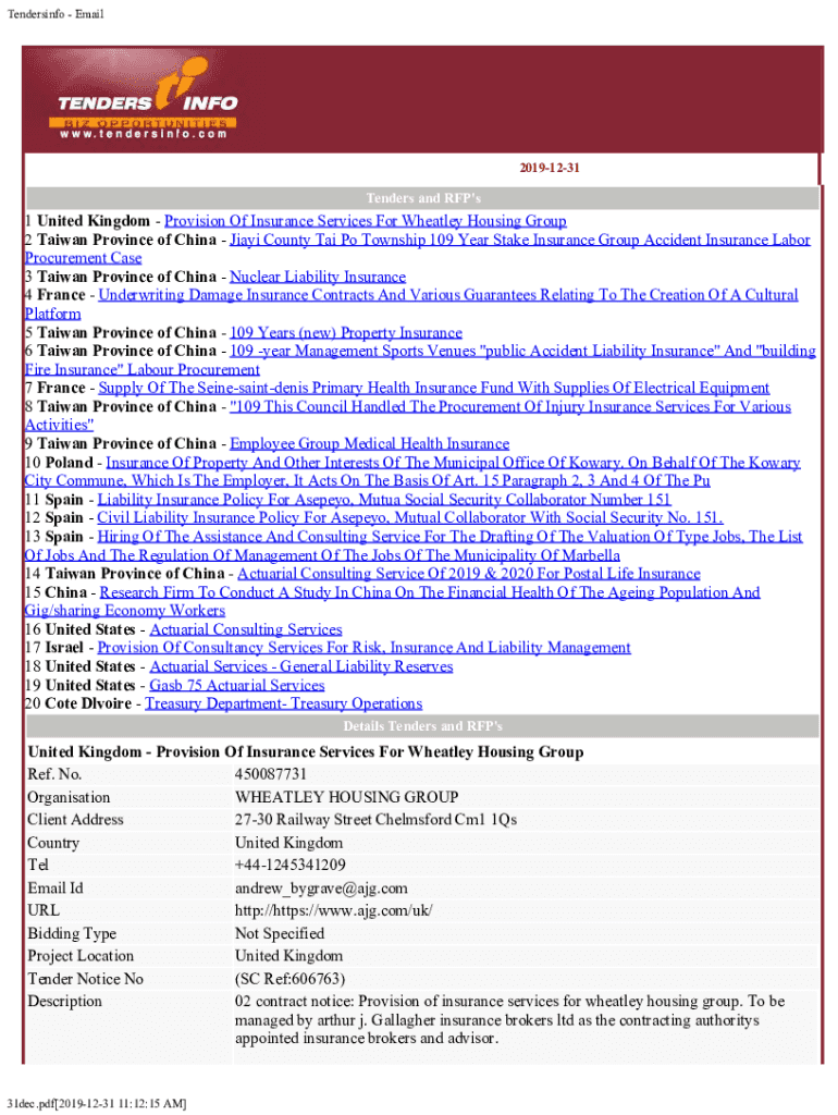 Tenders info Email20191231Tenders and RFP\'s1 United Kingdom Provision Of Insurance Services For Wheatley Housing Group 2 Taiwan Province of China Jay County Tai Po Township 109 Year Stake Insurance
