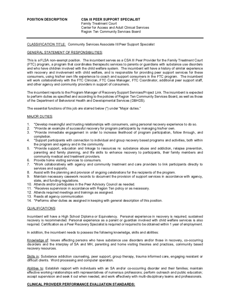 POSITION DESCRIPTION CSA III PEER SUPPORT SPECIALIST Family Treatment Court Center for Access and Adult Clinical Services Region Ten Community Services BoardCLASSIFICATION TITLE: Community Services