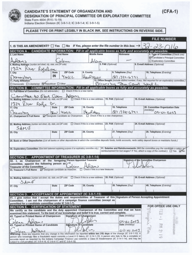(CFA1)CANDIDATE\'S STATEMENT OF ORGANIZATION AND DESIGNATION OF PRINCIPAL COMMITTEE OR EXPLORATORY COMMITTEE State Form 4604 (R15 / 519) Indiana Election Division (1C 3913; 1C 3914; 1C 3915)PLEASE