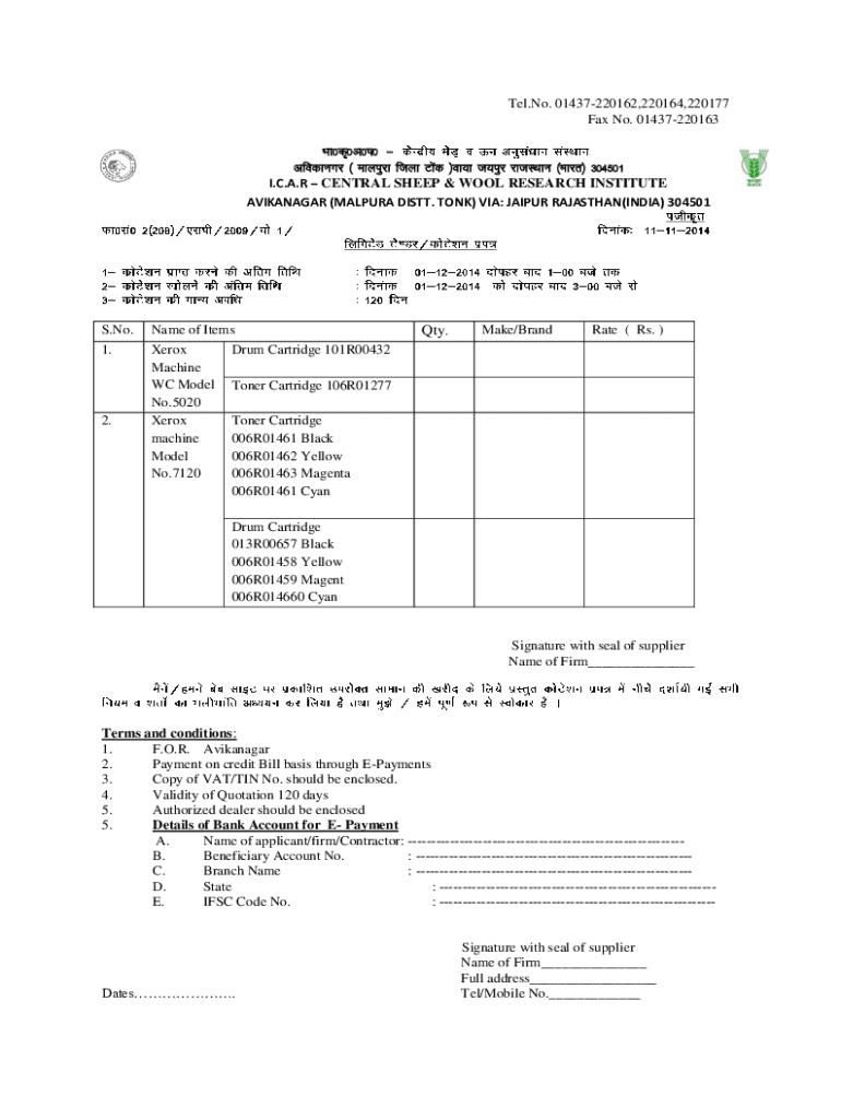 Tel.No. 01437220162,220164,220177 Fax No. 01437220163 Hkk0d`0v0i0 vfodkuxj ekyiqjk fly VSD an ok;k t;IQ jktLFkku Hiker 304501 I.C.A.R CENTRAL SHEEP & WOOL RESEARCH INSTITUTE AVIKANAGAR (MAURA DIST.